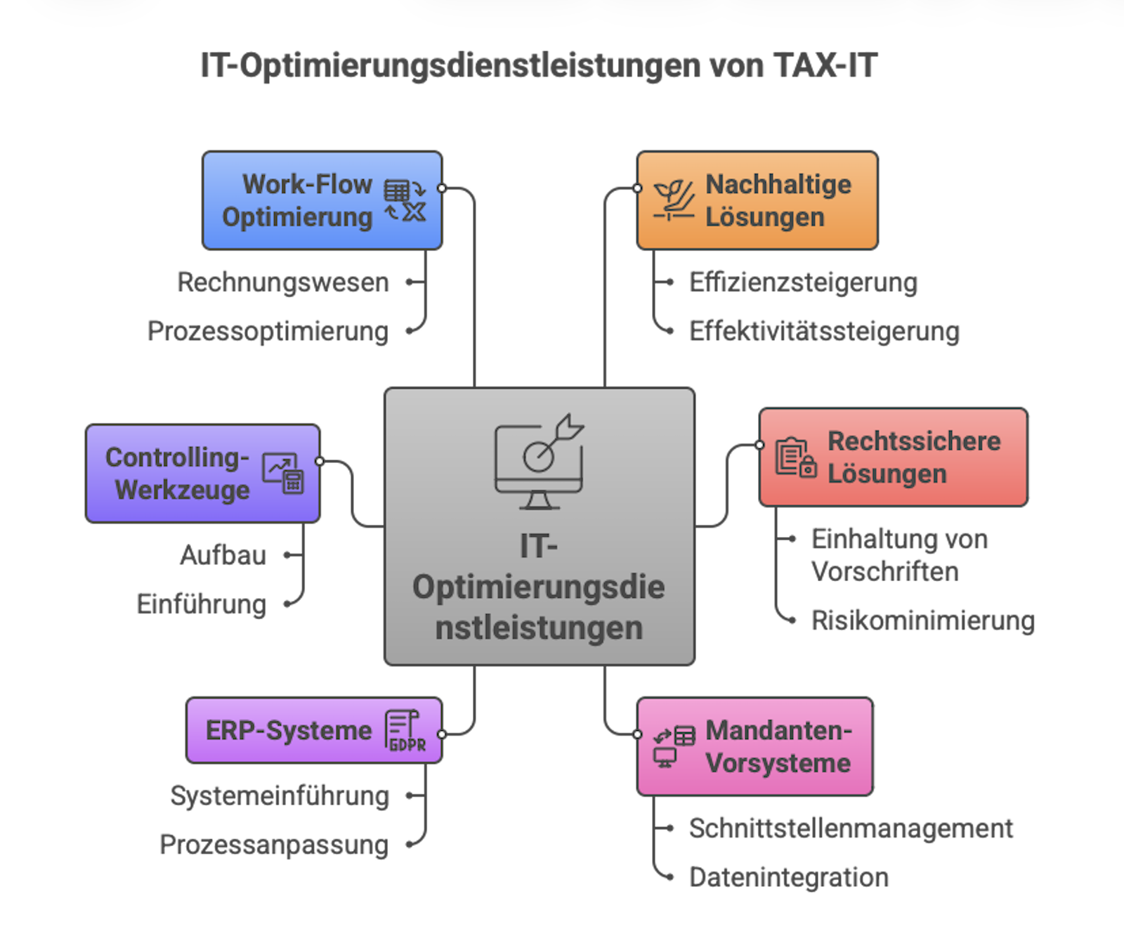 Unser Ansatz konzentriert sich auf nachhaltige und rechtssichere Lösungen, die speziell auf die Bedürfnisse unserer Mandanten zugeschnitten sind. Wir bieten umfassende Unterstützung in verschiedenen Bereichen, darunter Schnittstellenmanagement von Mandanten-Vorsystemen, Begleitung bei der Einführung von ERP-Systemen, Aufbau und Einführung von Controlling-Werkzeugen sowie Work-Flow Optimierung im Rechnungswesen. Unser Ziel ist es, die Effizienz und Effektivität Ihrer IT-Infrastruktur zu steigern und gleichzeitig die Einhaltung aller relevanten Vorschriften zu gewährleisten.Unsere Beratungsschwerpunkte: